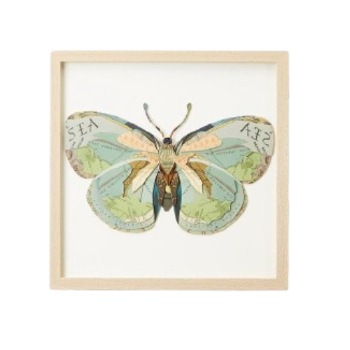 assorted butterflies, each a collage of paper maps, 16" x 16"