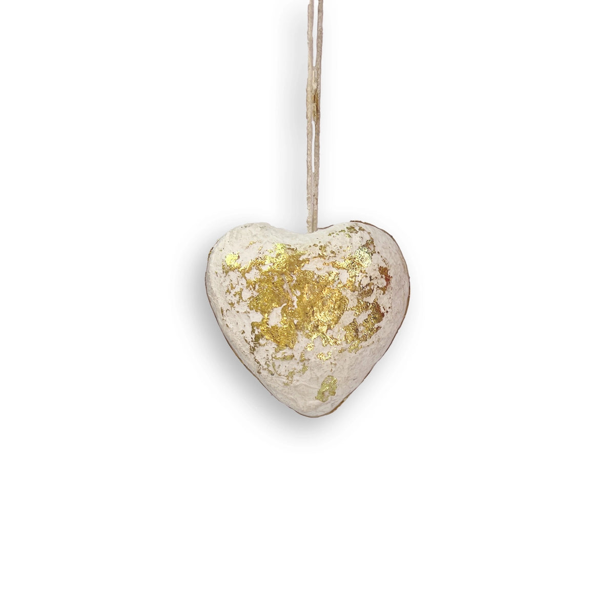 2.5" x 2.5" white paper mache heart ornament with gold accents